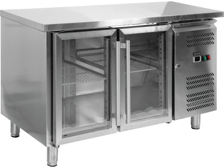 Stół do przechowywania żywości z bocznym agregatem oraz drzwiami z podwójnego, hartowanego szkła.