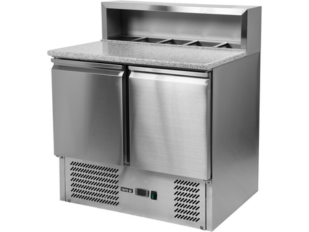 Stół chłodniczy 2-drzwiowy marki YATO YG-05275 z blatem roboczym z marmuru oraz nadstawką.