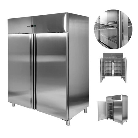 Model z samozamykającymi się drzwiami wyposażonymi w zamek oraz wygodnym uchwytem do otwierania. Na każde drzwi w zestawie są po 3 półki rusztowe powlekane PVC o nośności max 40kg - przy równomiernym obciążeniu. Umożliwia przechowywanie pojemników GN 2/1. Komora chłodnicza posiada oświetlenie.